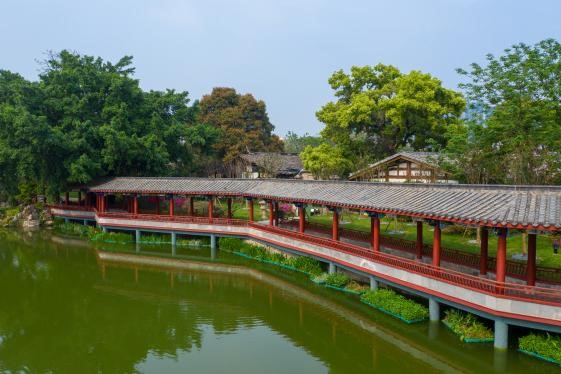 百米长廊,全木质结构,梁上为苏式彩绘,绘制的自然山水,花鸟鱼虫,栩栩如生,形象各异。是连接中庭、后院(绘春园)的主要景观廊道,并为福州最长最靓的古长廊之一